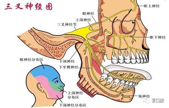 上颌神经也是一般躯体感觉神经,自三叉神经节发出后,立即进入海绵窦外侧壁,之后经圆孔出颅,进入翼腭窝,再经眶下裂入眶,续为眶下神经。上颌神经分支分布于上颌各牙、牙龈、上颌窦、鼻腔和口腔的粘膜以及睑裂间的面部皮肤以及部分硬脑膜。