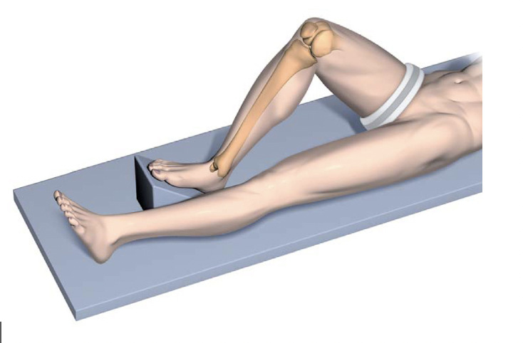 根据手术方式决定患者体位,仰卧位(常见)或俯卧位(跟腱重建等需要)。患肢常规消毒铺巾。止血带充气至250mmHg。