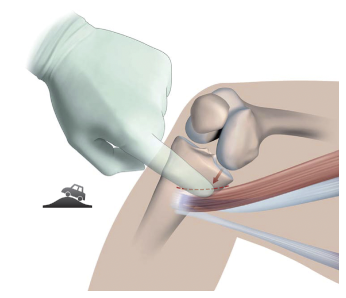 1) 用手指触摸,容易确定止点位置(类似于斜坡的感觉)。于胫骨结节顶点和胫骨后内侧缘中点做一斜行切口。