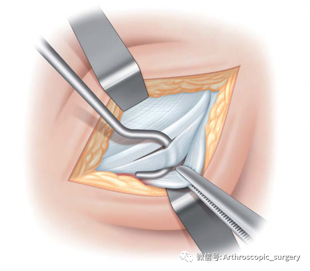 用组织剪将之前用尖刀片切开的缝匠肌腱膜扩大