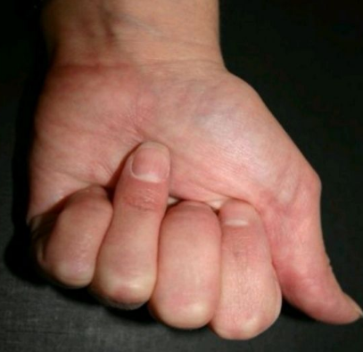 存在球衣指的运动员通常表现为DIP关节及远节指骨掌面急性疼痛及肿胀。检查可能发现从远节指骨沿指屈肌腱向近端延伸的疼痛。手指压痛最严重处可能是回缩的撕脱肌腱残端。球衣指具有诊断意义的表现是不能主动屈曲DIP关节。