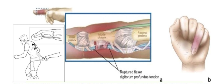 指深屈肌(flexor digitorumprofundus, FDP) 腱从远端附着点断裂通常称为球衣指。这种损伤最常见于从事身体接触性运动(例如美式橄榄球或英式橄榄球)的运动员,无名指是最常见的损伤部位,占损伤的近75%。