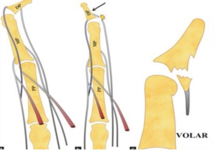 球衣指损伤相关的手指解剖:FDP腱沿着手掌和手指的掌侧走行,在远端穿过指浅屈肌(flexor digitorumsuperficialis, FDS)腱的裂隙,止于远节指骨的基底。FDP负责远端指间关节的屈曲,在止点处最为薄弱。