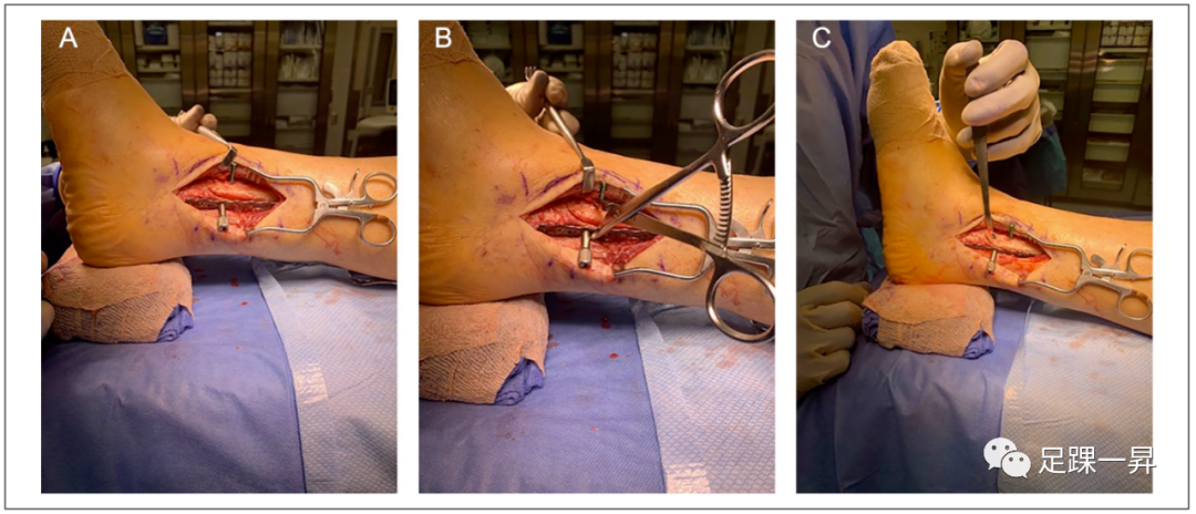 图1 展示复位过程的手术图像。(A)使用锁定螺钉将钢板固定到骨折远端部分,并且将锁定套筒连接到钢板上;双皮质螺钉放置在腓骨近端的上方而不是下方。(B)在锁定套筒和双皮质螺钉之间放置复位钳,以复位骨折。(C)将钢板固定在腓骨的近端,以稳定复位。