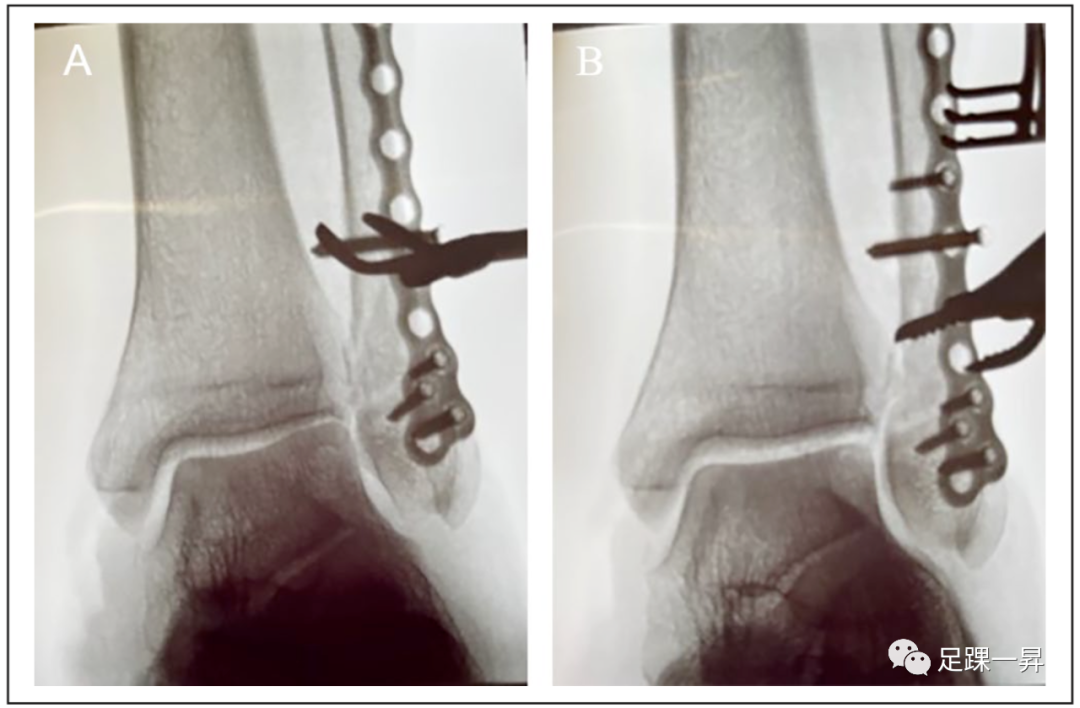 图2 展示复位技术的透视图像。(A)复位夹放置在锁定套筒和双皮质螺钉之间。此时腓骨缩短,这表现为踝穴外侧间隙缩窄。(B)通过复位钳牵引复位后踝穴解剖复位。