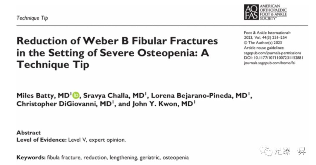 外踝骨折是常见的损伤,Weber B型外踝骨折中踝关节不稳定的情况下需要手术治疗。通常腓骨缩短2 mm、侧向移位1 mm或外旋5度的移位已被证明可增加踝关节的接触压力。手术可恢复腓骨长度、旋转和力线,同时取得下胫腓联合的解剖复位。