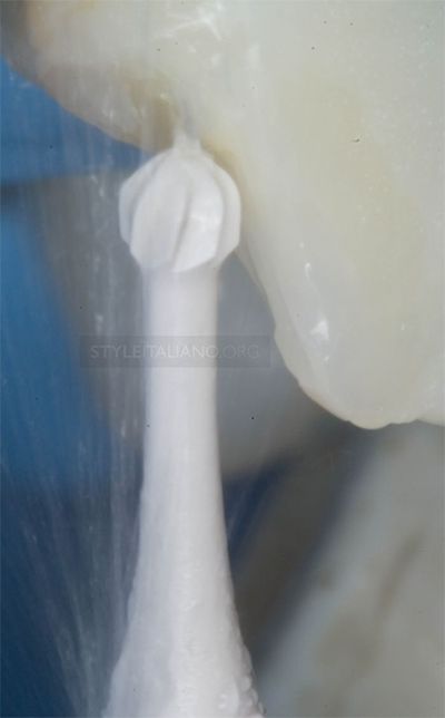 图19取下硅胶键后,我们用氧化铝盘去除远端多余的复合材料,注意不要破坏蜡制的解剖结构。