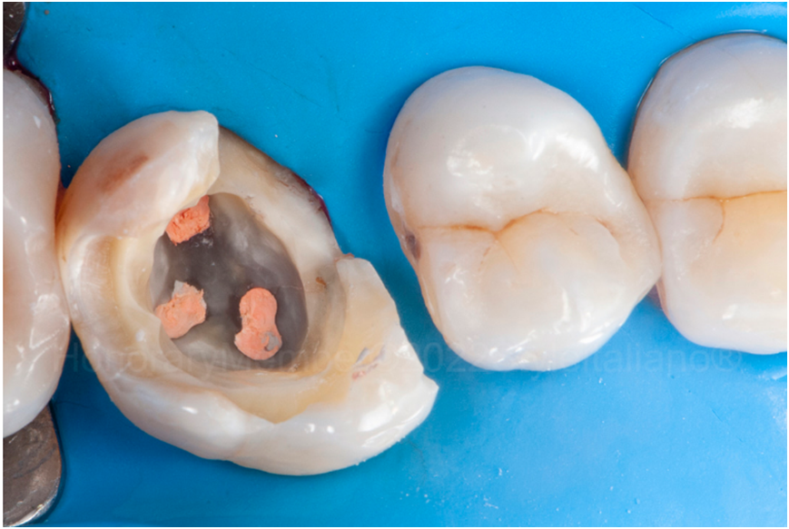 图8. 使用双固化通用粘合剂粘接纤维桩。对根管中的粘合剂进行化学活化是极其重要的,即使纤维桩是半透明的,我们也不能依靠简单的光固化。我们还必须注意小心地将粘合剂涂在牙齿上,所以强烈推荐使用特殊的小刷子。我们必须记住,粘接是粘接修复最关键的部分,如果粘接层失效,则修复失败。双重固化复合材料用于粘固桩,同时用于堆塑树脂核。为此,选择理想的材料至关重要。我们都需要化学固化和光固化,所以我们可以改进,然后我们依靠化学过程来完成这个过程。我们还需要一种混合良好的可流动材料,配有实用功能的注射头,以避免留下气泡或空隙。同时,我们需要固化后的材料坚硬、坚固、有抵抗力,以支撑未来的修复牙冠。