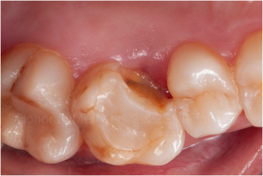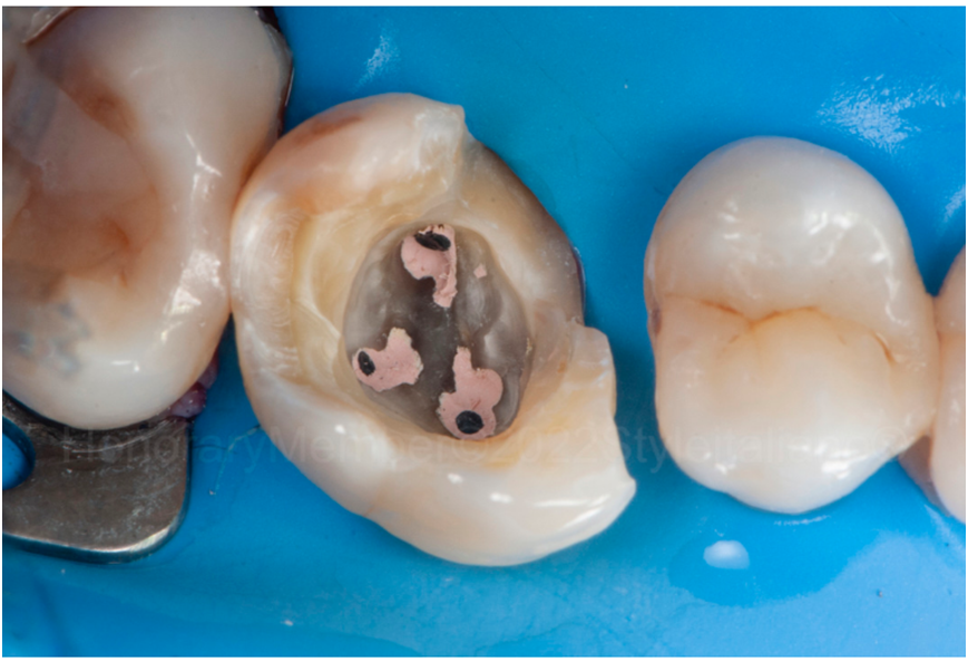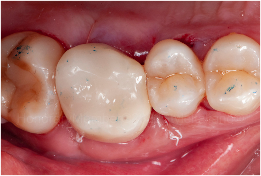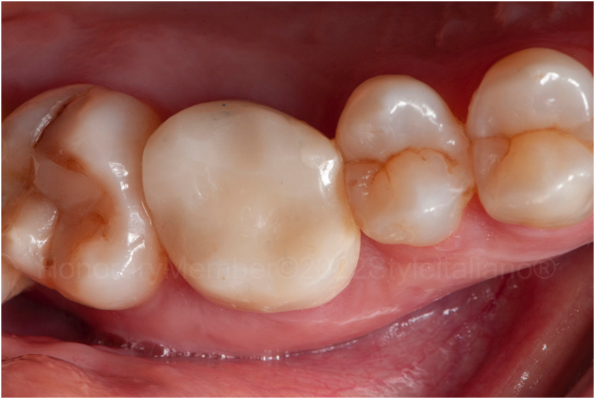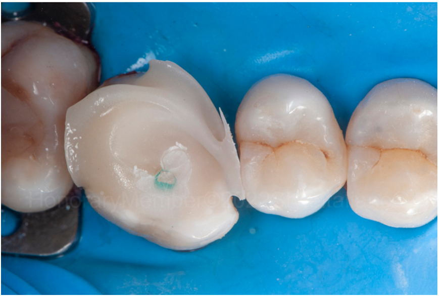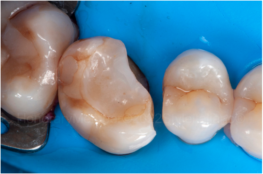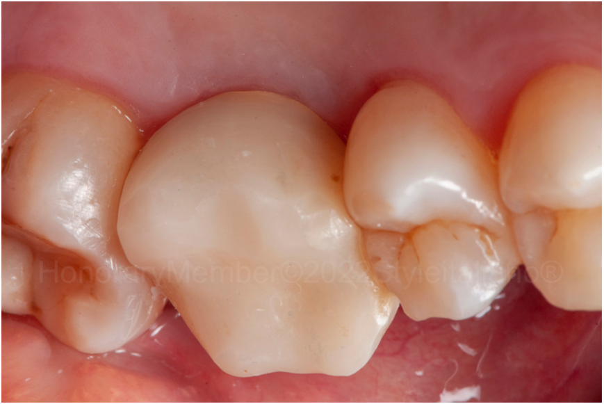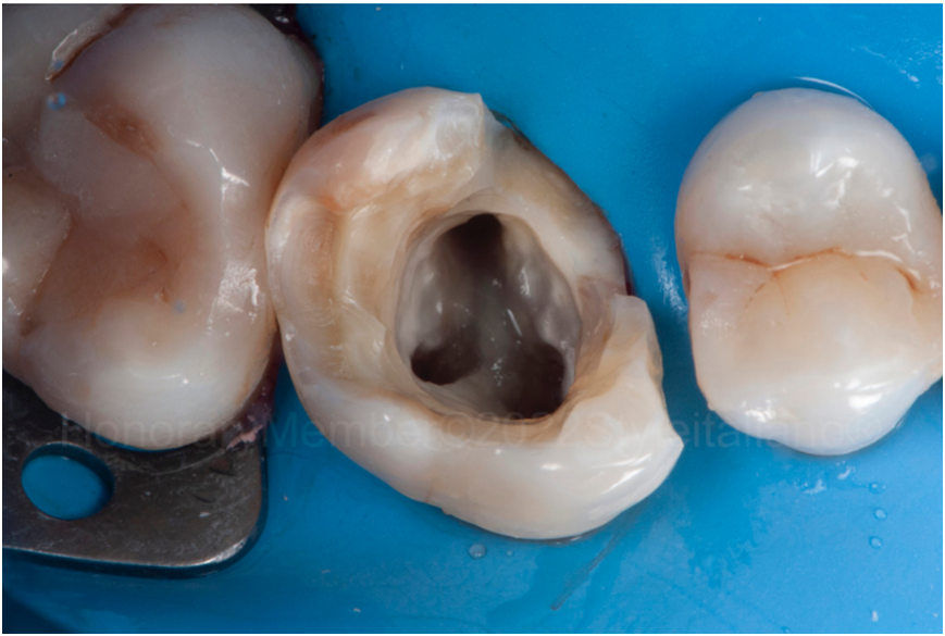 图9. 去除橡皮障后,进行全冠修复的牙体预备。我发现在准备过程中使用具有牙本质感觉的修复材料非常重要,这样可以更容易达到最终的基牙精度。