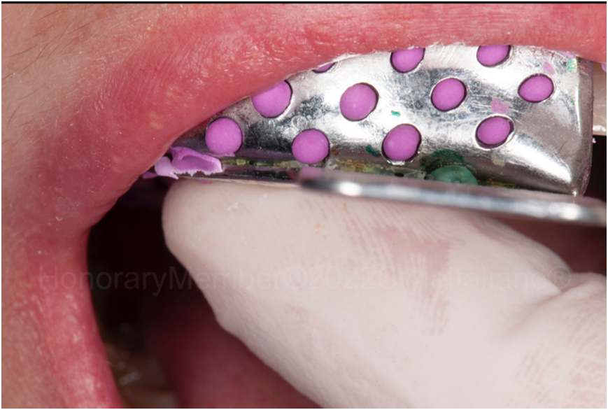 图10. 将高强度自固化材料直接注射到藻酸盐印模中,在用凡士林隔离基牙后,将托盘放回口腔中。