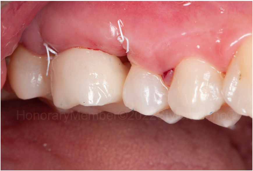 图14. 病人有几个月没有复诊,这里我们可以看到手术后10周腭部组织(折裂处)的愈合。患者很高兴,牙齿保留住了,因为有一个很坚固的临时冠,足以她等待最终的氧化锆冠。