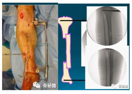 牵引架维持复位,对于多段的骨折,复杂粉碎的那种,可以应用牵引架辅助牵开复位,牵引架同时就固定了近端和远端。