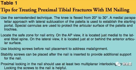 应用半伸直技术,膝关节屈曲20-30°,内侧髌前入路,髌骨外侧半脱位时来进行入针点,应用套管来保护关节面和韧带,在正位和侧位上定位入针点,正位位于外侧棘的内侧,侧位位于前关节面的的边缘处,应用阻挡钉技术在植入螺钉前保持力线,插入髓内钉后应用阻挡钉来增加稳定性。近端锁定至少应用两个平面锁钉。