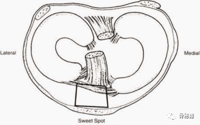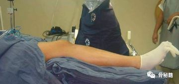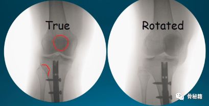 要想得到一个好的进针点,第一点就是有一个好的透视像,下肢的旋转要控制好,胫骨腓骨稍微重叠一部分,髌骨位于股骨髁的中央,即髌骨朝天。