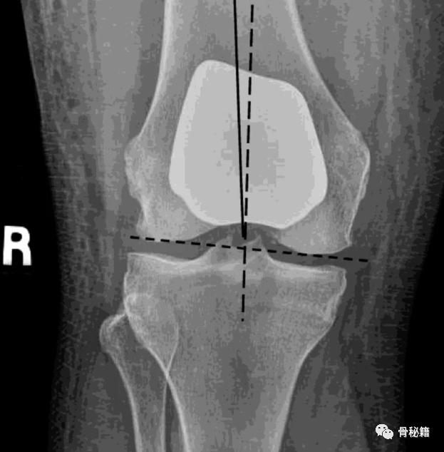 PFA 股骨组件与股骨远端关节线(虚线)对齐,而不与股骨轴线(实线)对齐
