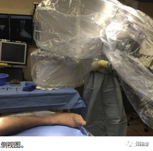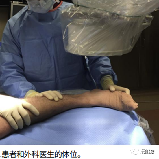 患者被放置在 X 射线可透⼿术台上的侧卧位,⼿术台有⻓的悬垂板,可容纳⼤型 C 臂通过,⼿术外科医⽣位于患者后⽅,以便为⻣折复位和螺钉放置提供最佳位置
