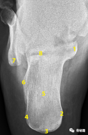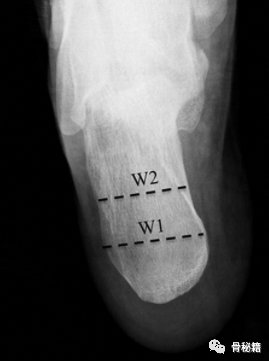 2. 轴位片。主要用于评价跟骨外翻畸形程度、宽度、后关节面的塌陷及与跗骨窦的相对位置。