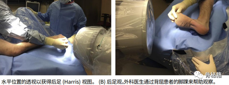 距下关节的可视化最好通过侧斜视图获得, 其中 C型臂向后滚动约30 度,稍微向床脚倾斜。可以通过不同的旋转和倾斜量进⼀步微调后⼩⾯和距下关节可视化。