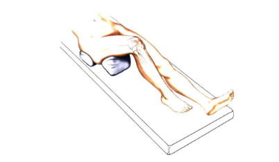 患者仰卧于可进行X线透视的手术台上,患肢膝关节下方放置一稳定的楔形物以使膝关节屈曲60°(图1)。患侧臀部放置小垫以纠正下肢轻微的外旋。这样可以确保髌骨位于正前方。通过抬高患肢3~5分钟或者使用软橡皮带驱血,然后止血带充气。