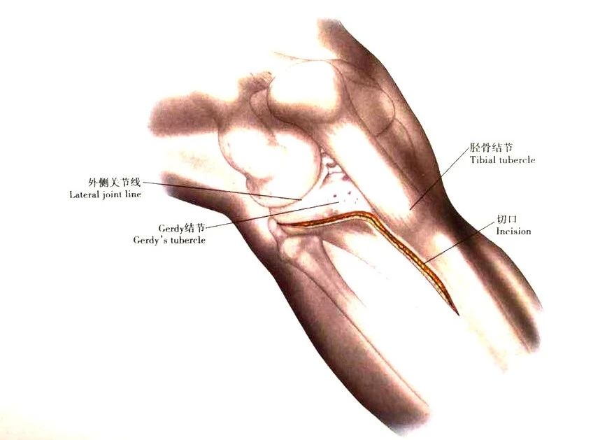 做一S形切口,切口起自关节线近端约3~5cm,恰好位于髌腱缘的外侧,弧形向前越过 Gerdy 结节,在胫骨前缘的外侧约1cm处向远端延长(图2)。切口的精确长度根据所需治疗的病理损伤范围和使用的内固定来确定。