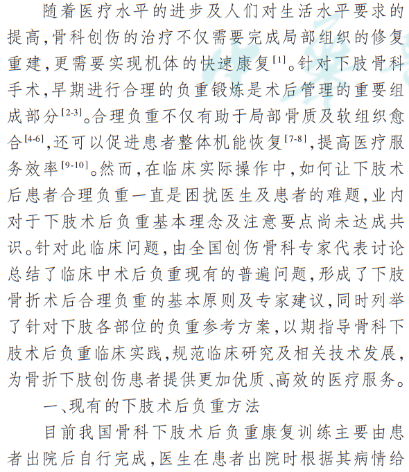 随着医疗水平的进步及人们对生活水平要求的提高,骨科创伤的治疗不仅需要完成局部组织的修复重建,更需要实现机体的快速康复。针对下肢骨科手术,早期进行合理的负重锻炼是术后管理的重要组成部分。合理负重不仅有助于局部骨质及软组织愈合,还可以促进患者整体机能恢复,提高医疗服务效率。然而,在临床实际操作中,如何让下肢术后患者合理负重一直是困扰医生及患者的难题,业内对于下肢术后负重基本理念及注意要点尚未达成共识。