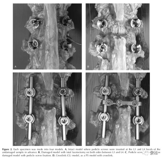四组标本模型:切除后柱的脊柱不稳模型、安置钉棒的不稳模型、钉棒+横联的不稳模型、正常脊柱模型。进行脊柱旋转扭曲测试对比。