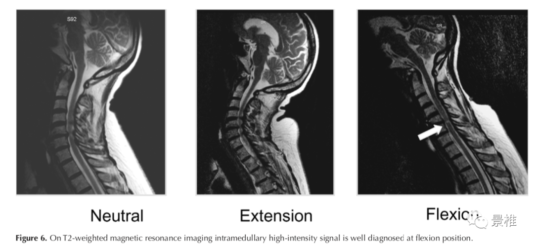 颈椎屈曲位MRI也有用武之地,比如平山病的诊断。在判断脊髓高信号(IHIS)方面也有奇效。图示后伸位MRI只看到脊髓压迫,看不到髓内信号改变,可能是被挤没了。但在屈曲位明显能看出C5髓内高信号。