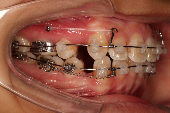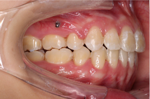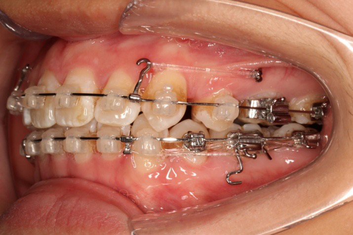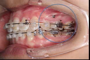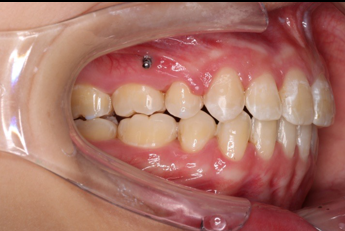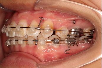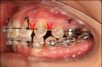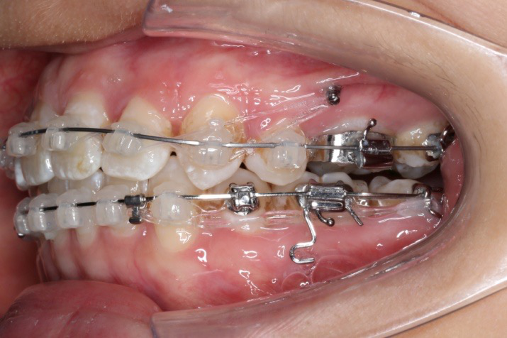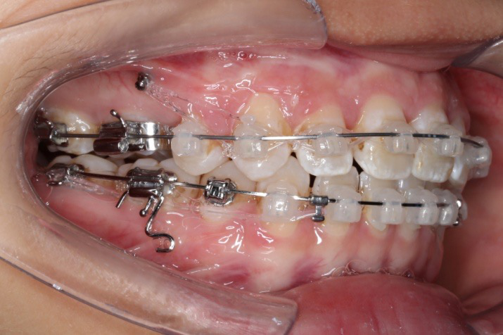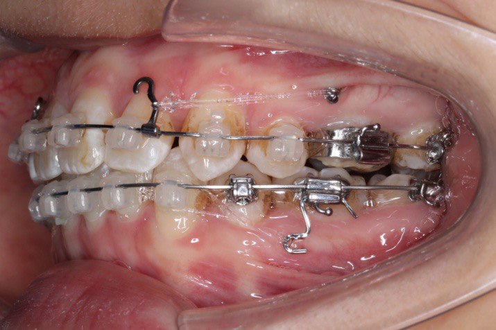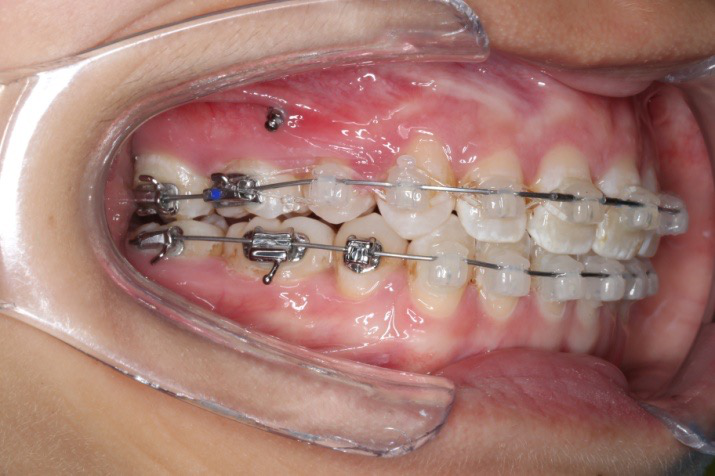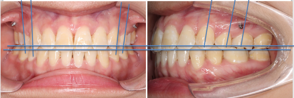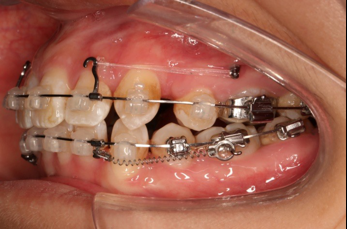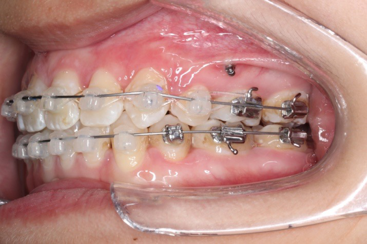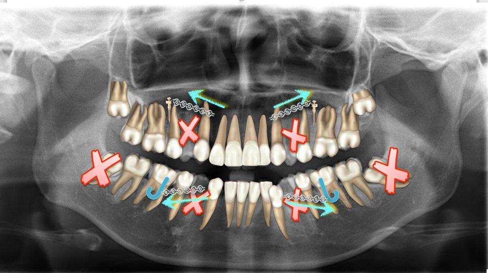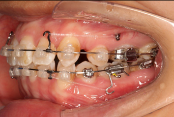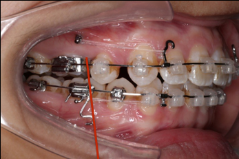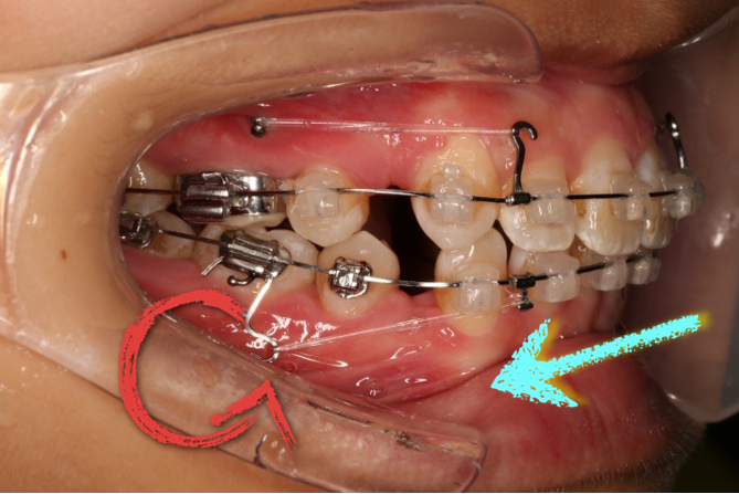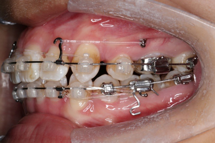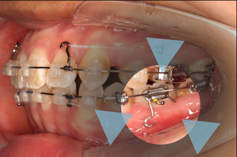 上颌使用高位种植钉及长牵引钩,配合尖牙近远中的v-bend,上颌前牙的牙齿移动方式是整体往上,往后内收。