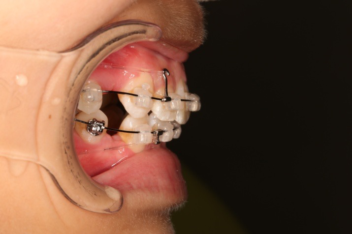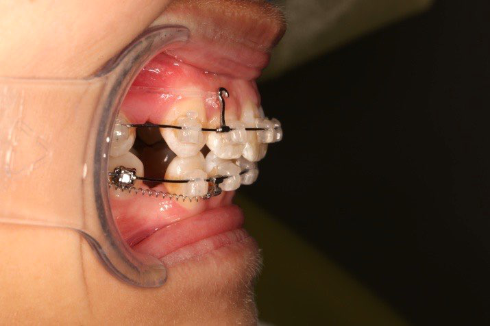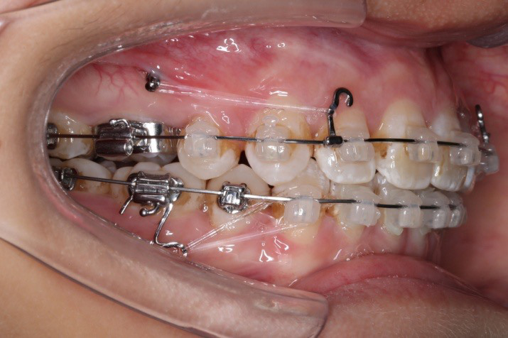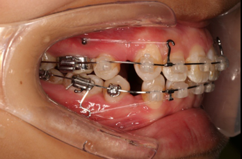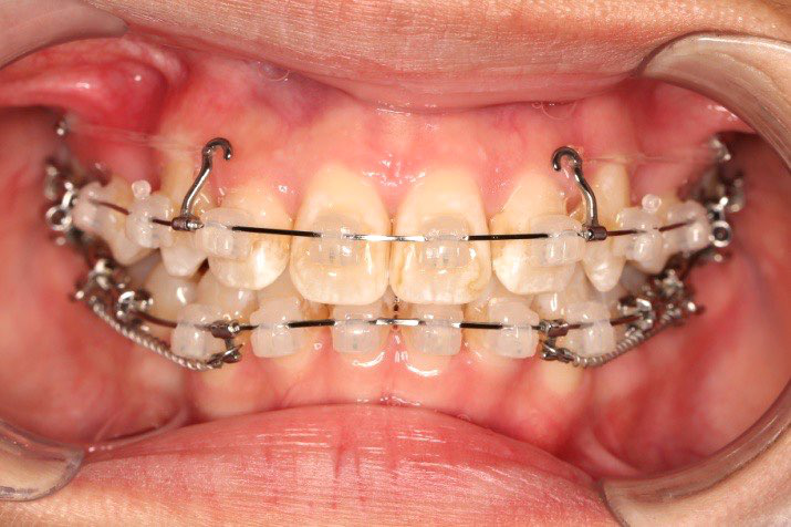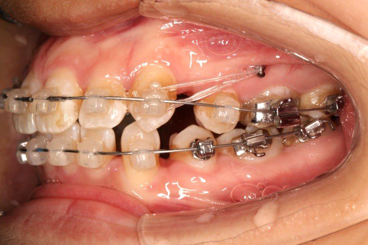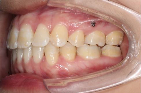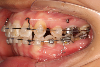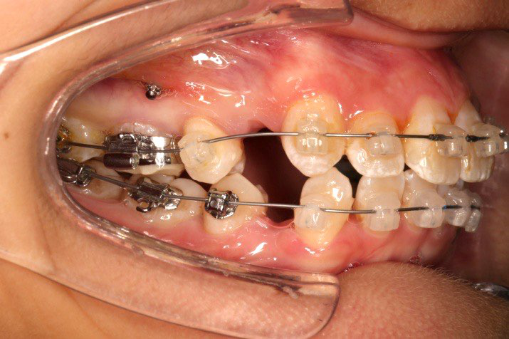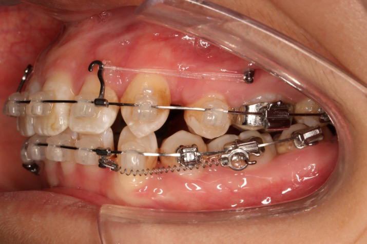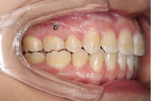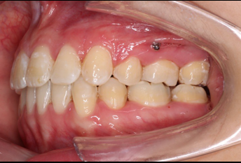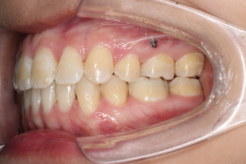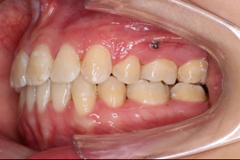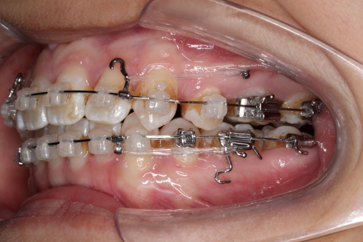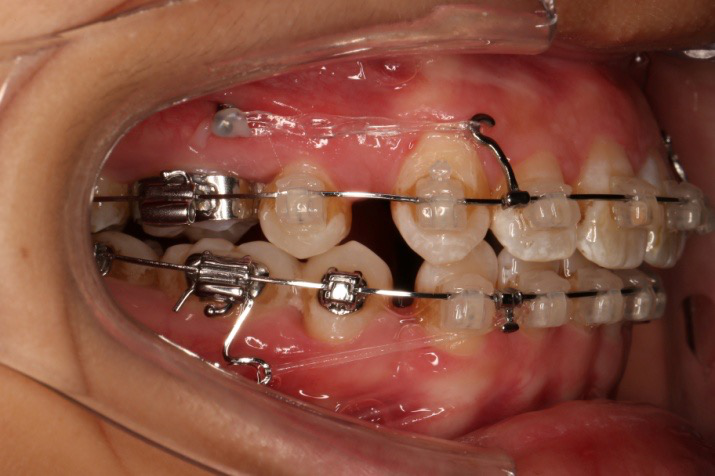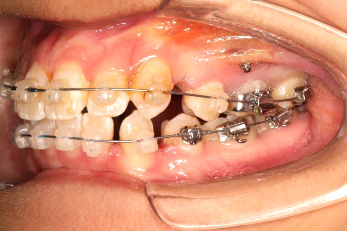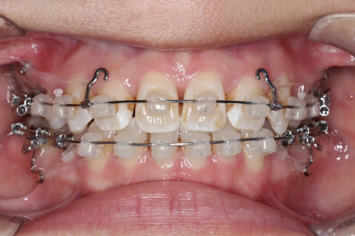 上颌使用高位种植钉及长牵引钩,配合尖牙近远中的v-bend,上颌前牙的牙齿移动方式是整体往上,往后内收。