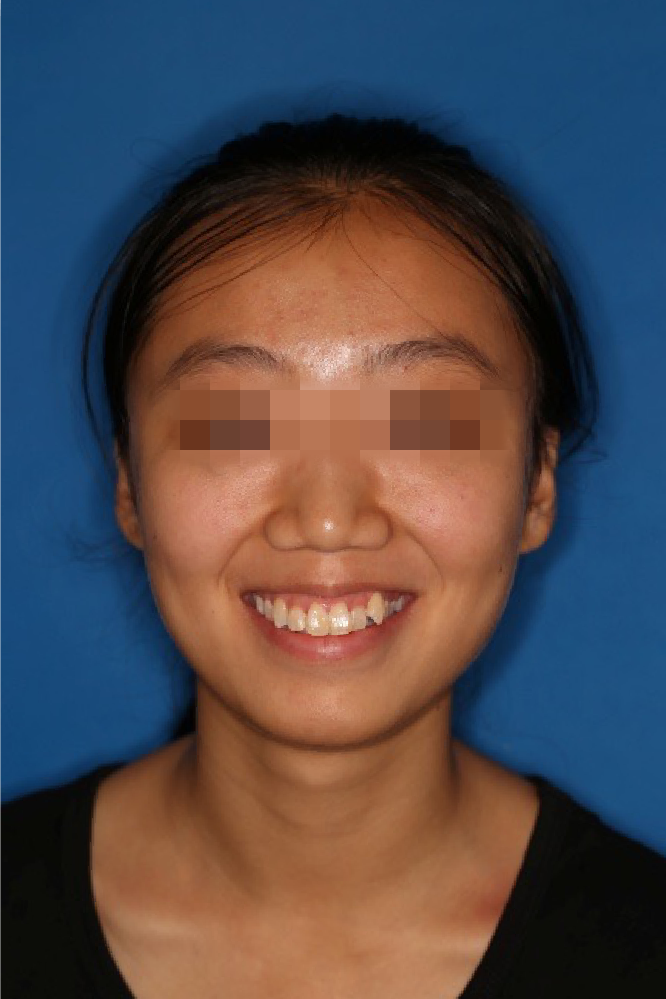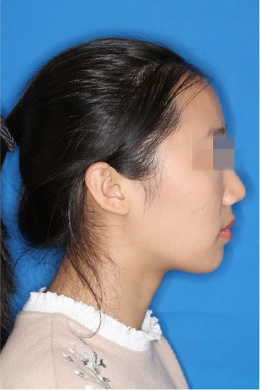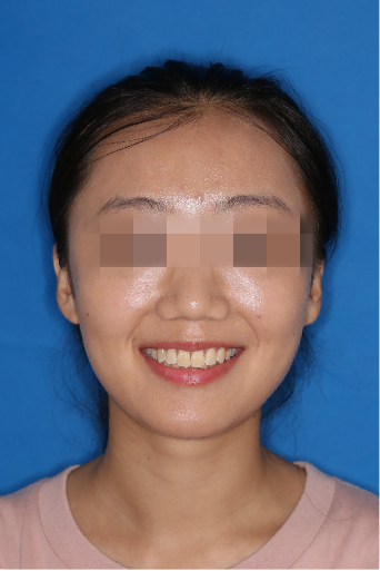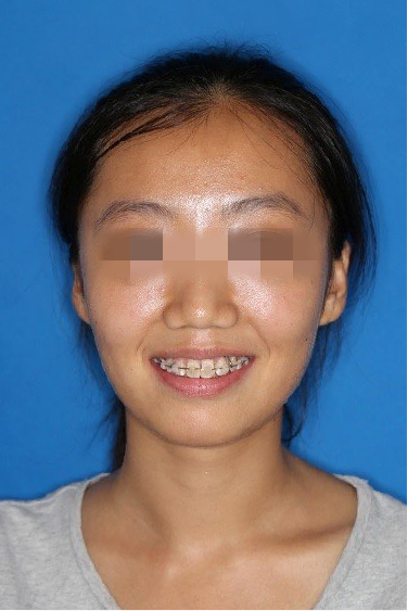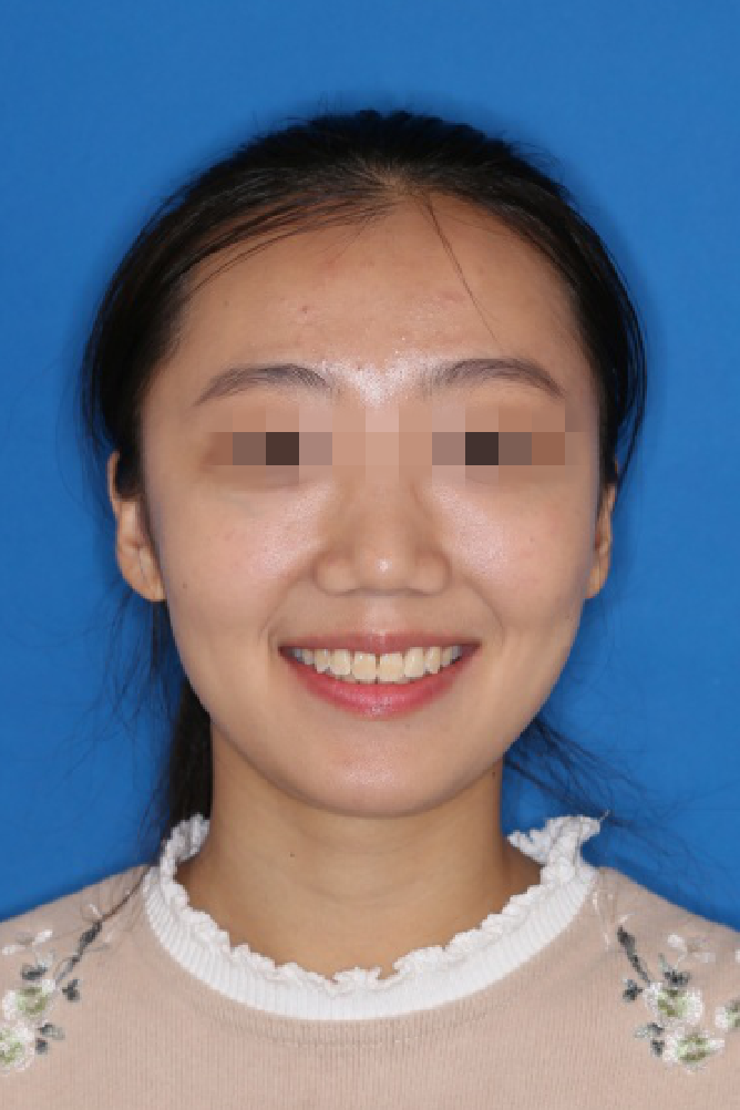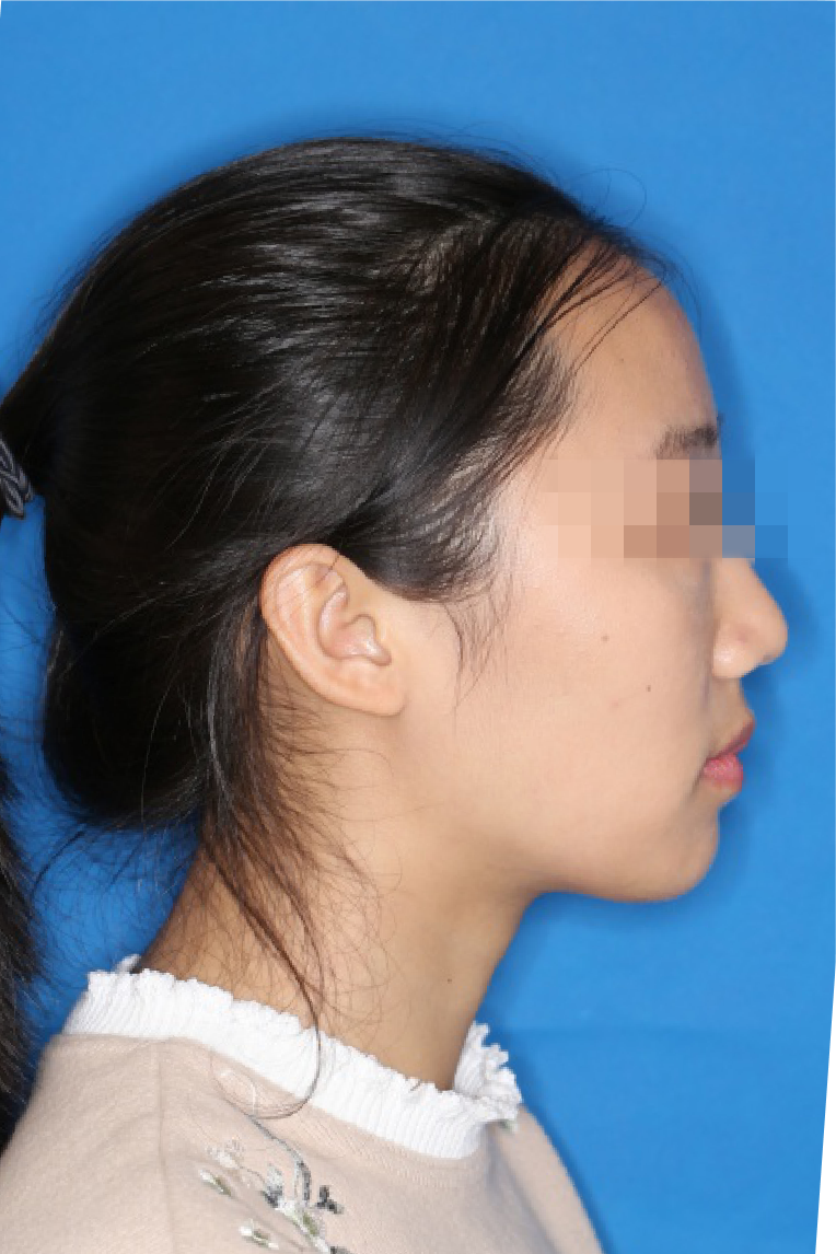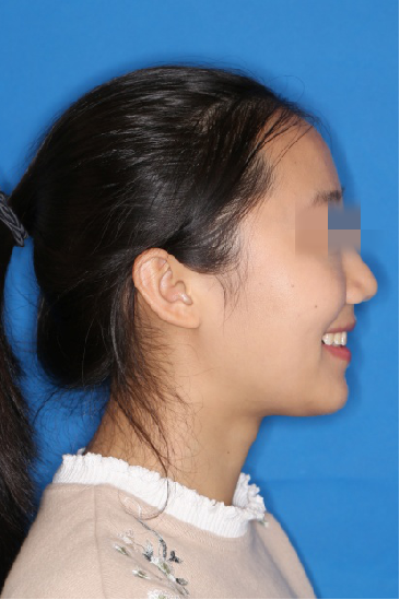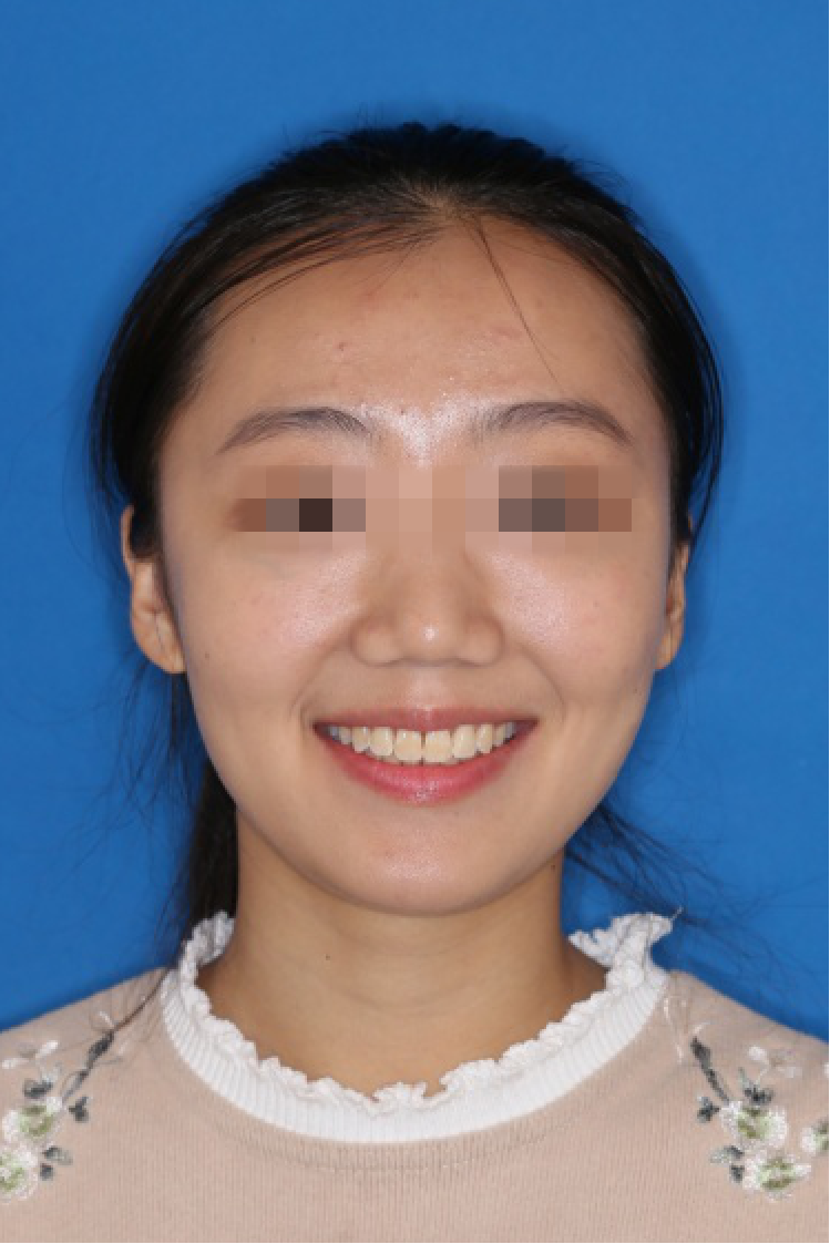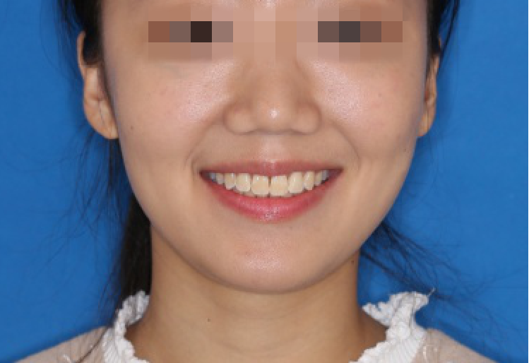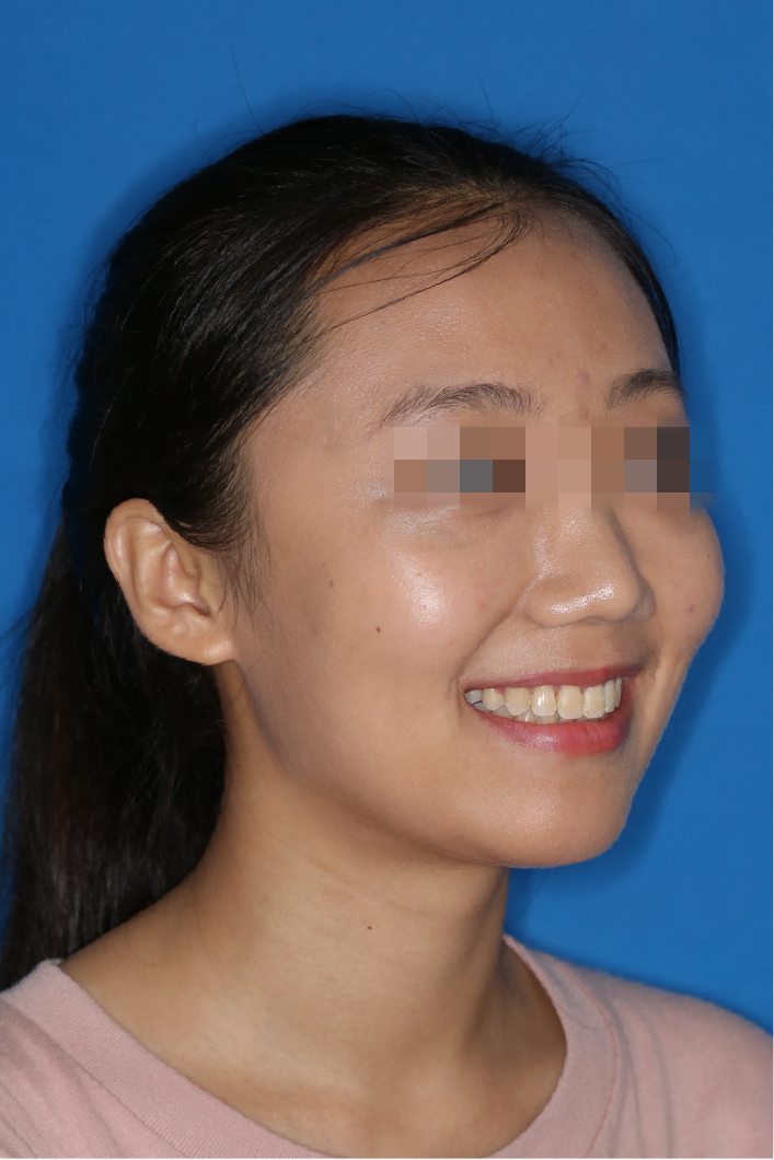 宏观评价:面部对称,面下三分一比例协调,上下唇凸度正常,上颌牙列内收转矩控制良好,下颌后缩改善,颏唇沟变得更加柔和,术后达到基本直面型。