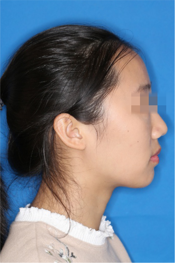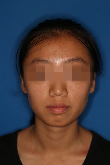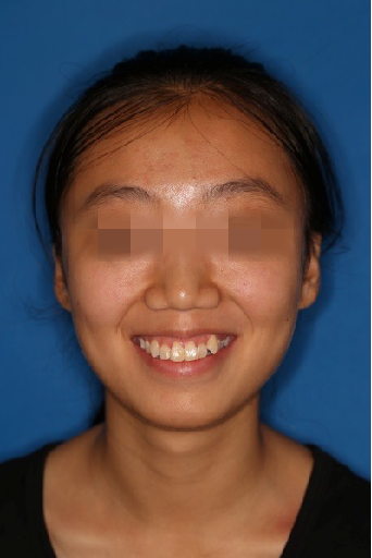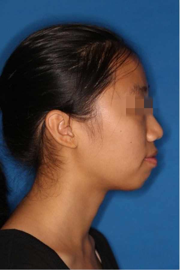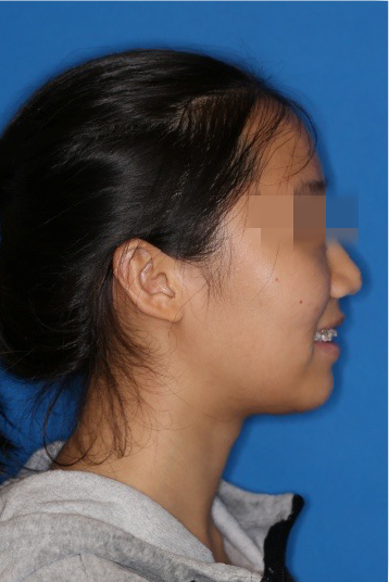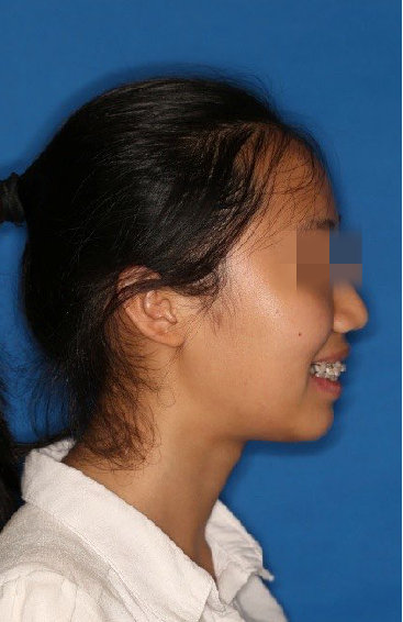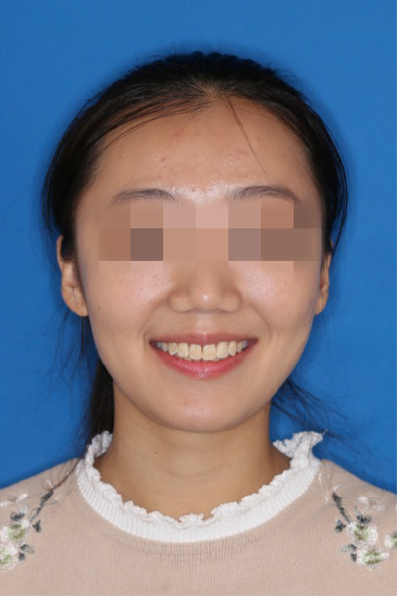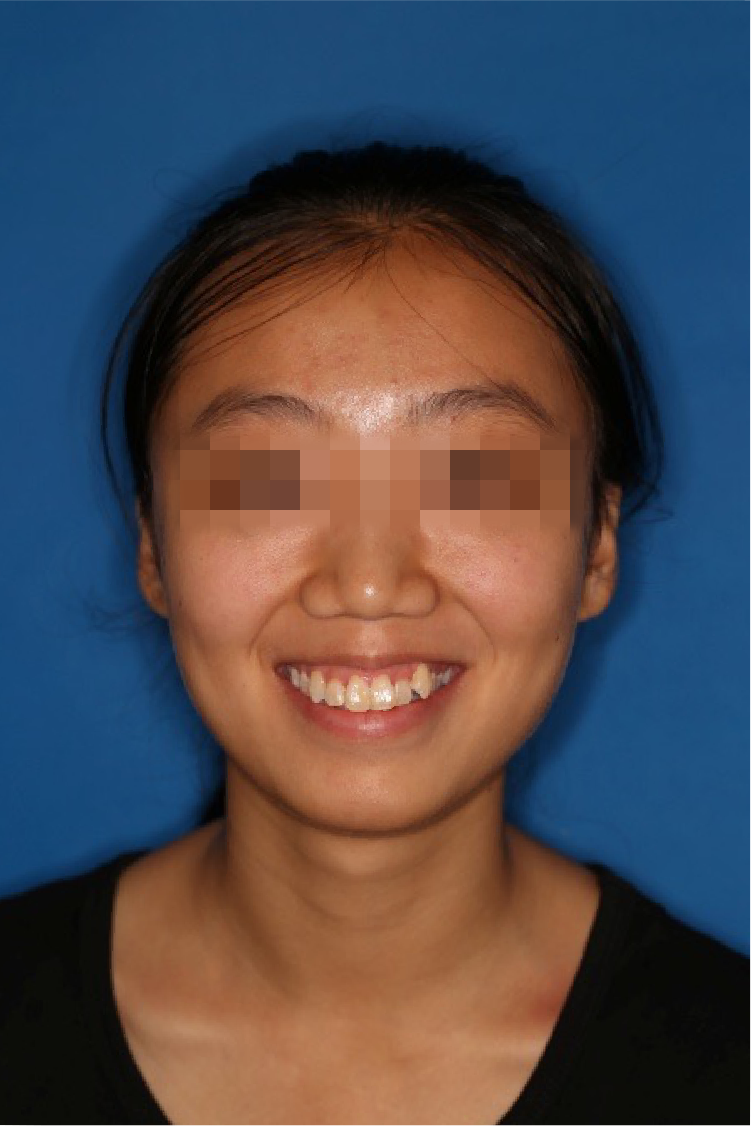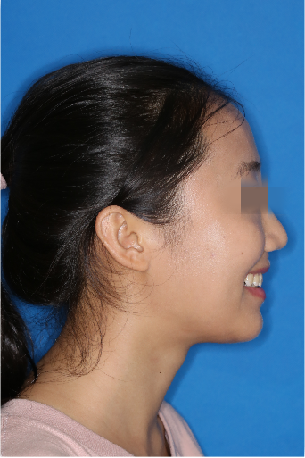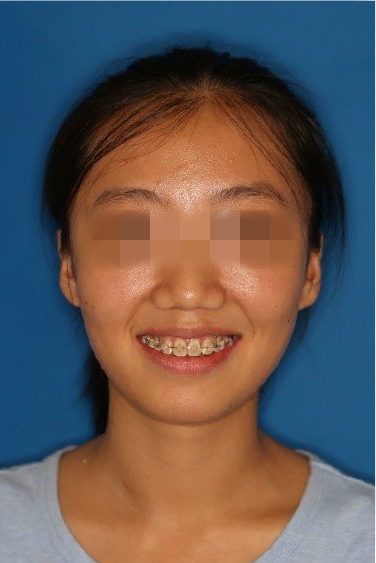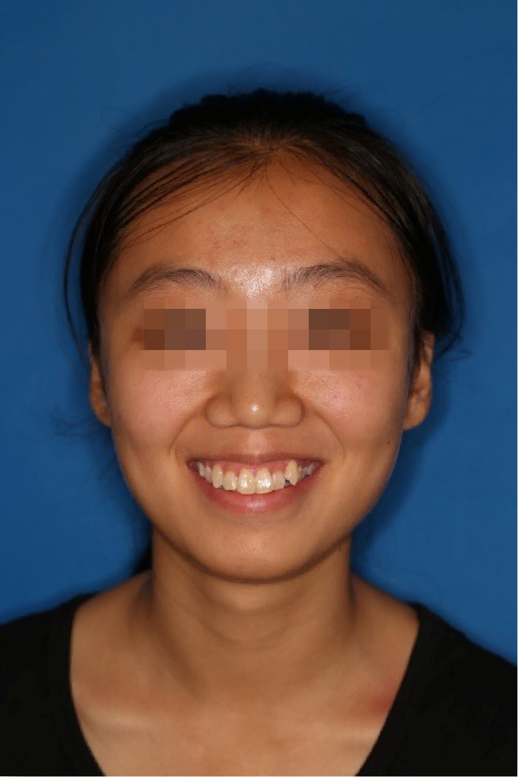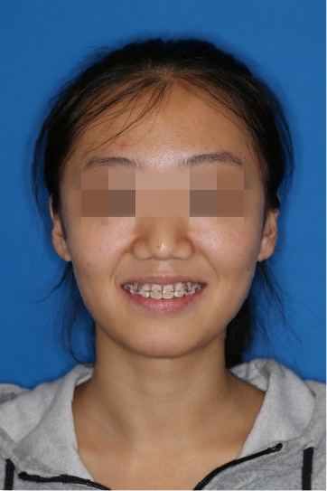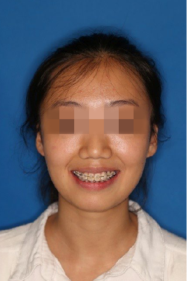 宏观评价:面部对称,面下三分一比例协调,上下唇凸度正常,上颌牙列内收转矩控制良好,下颌后缩改善,颏唇沟变得更加柔和,术后达到基本直面型。
