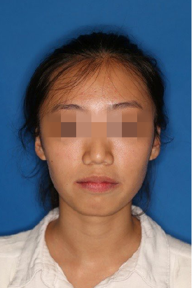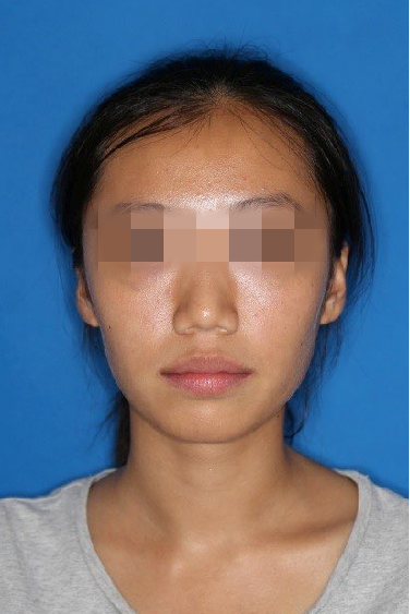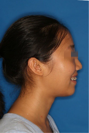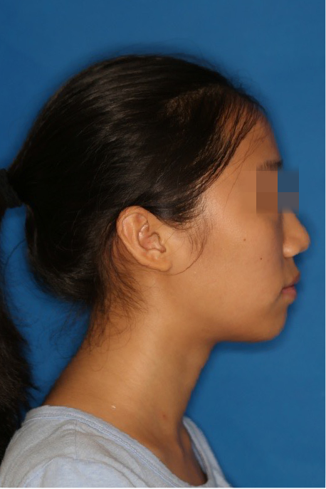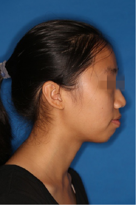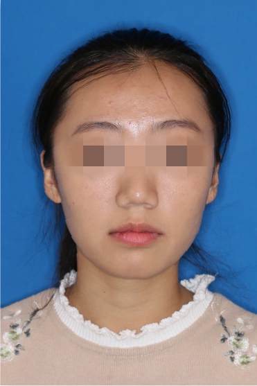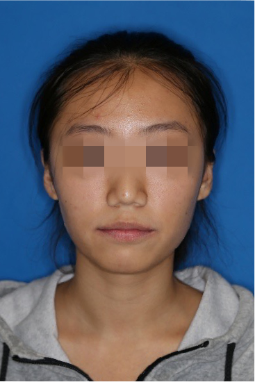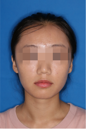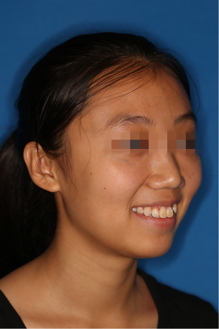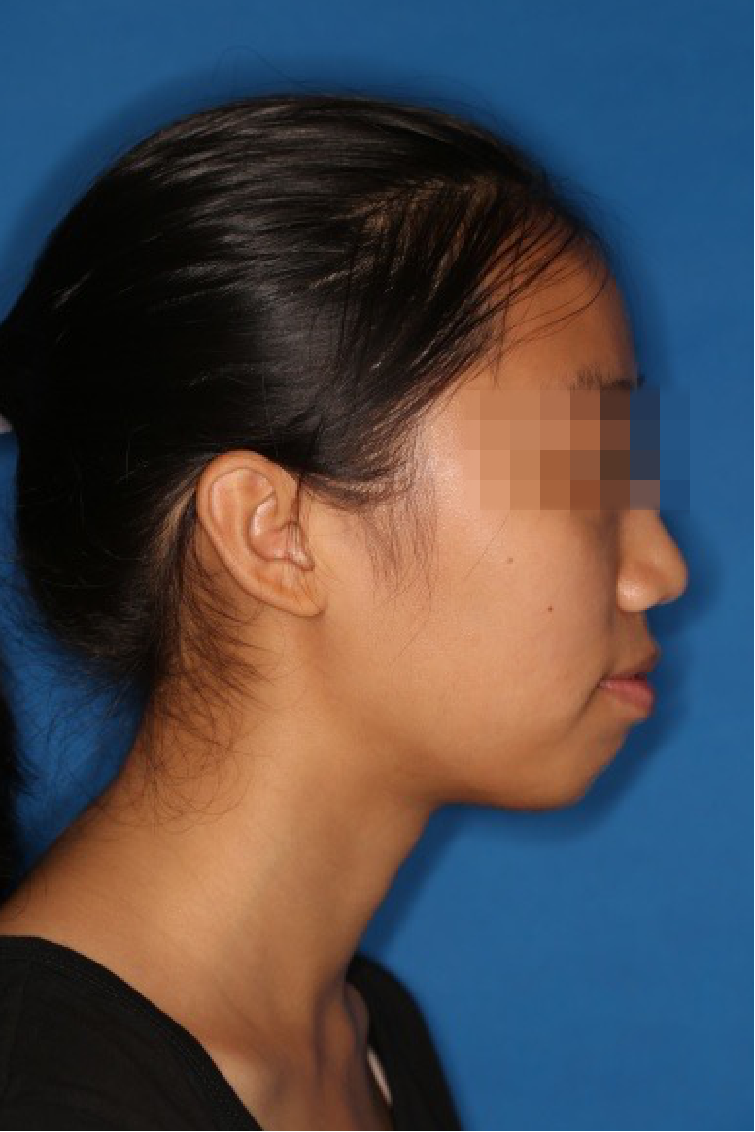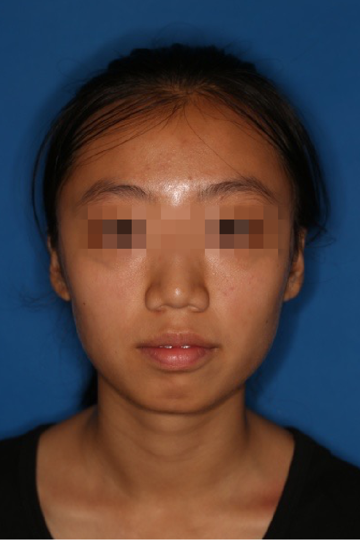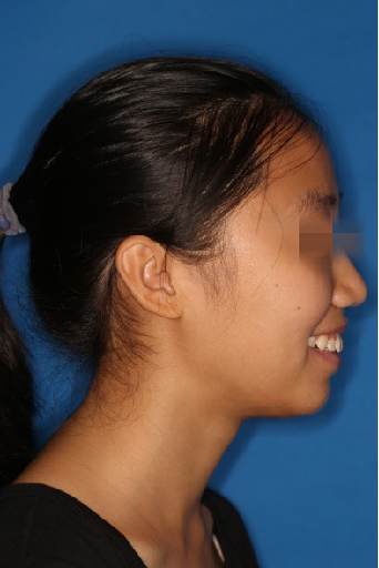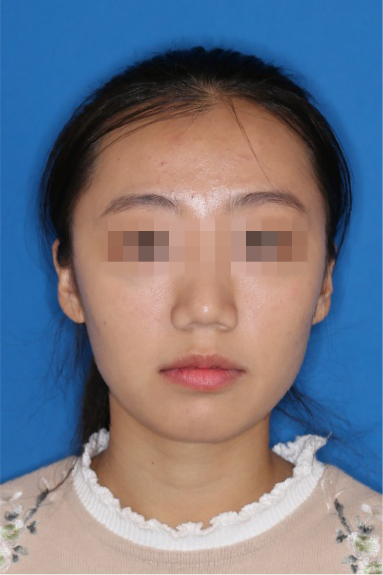 宏观评价:面部对称,面下三分一比例协调,上下唇凸度正常,上颌牙列内收转矩控制良好,下颌后缩改善,颏唇沟变得更加柔和,术后达到基本直面型。