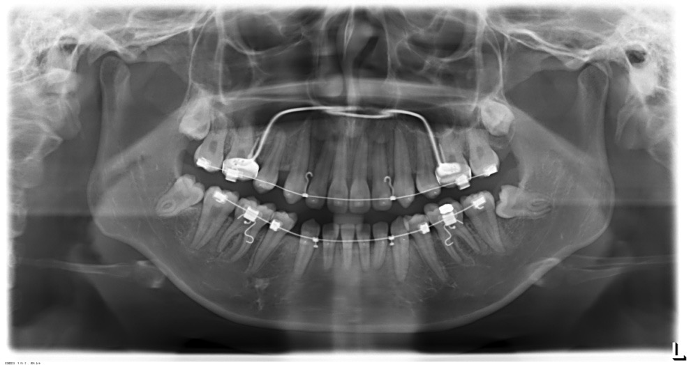 1.因患者异地上学,早期复诊间隔太长,下颌支抗保护不足,造成下颌磨牙的近中倾斜;