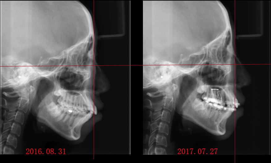 1.拔牙矫治,拔除14、24、34、44,上颌TPA+上颌高位支抗钉内收前牙及压低前牙,改善侧貌突度及露龈笑