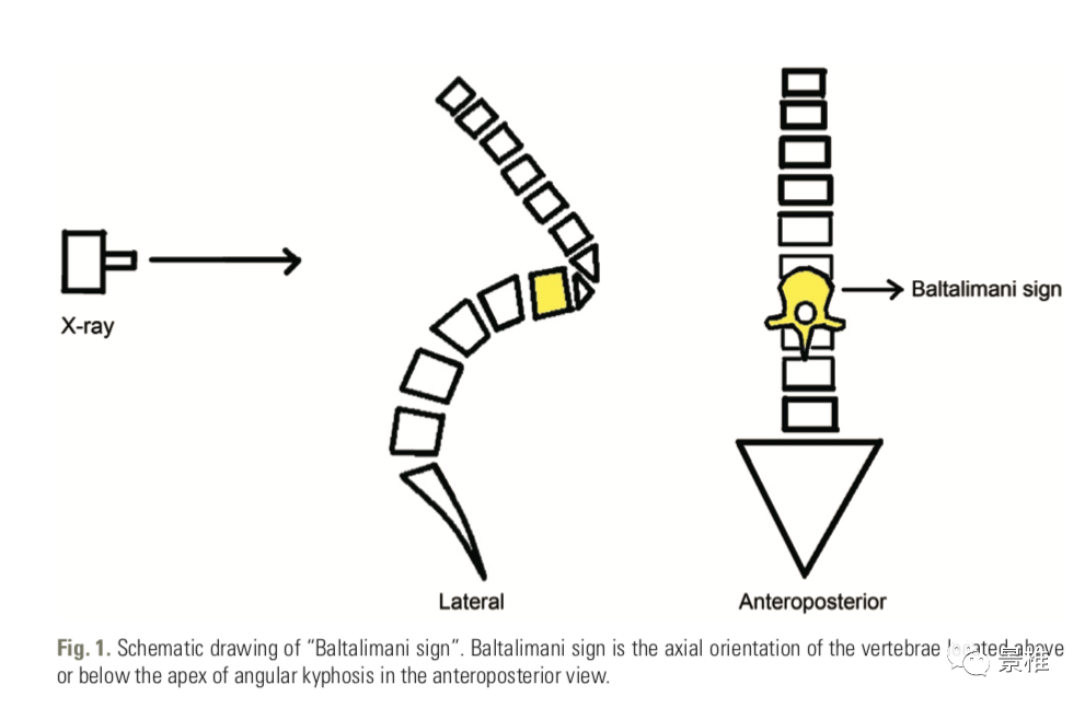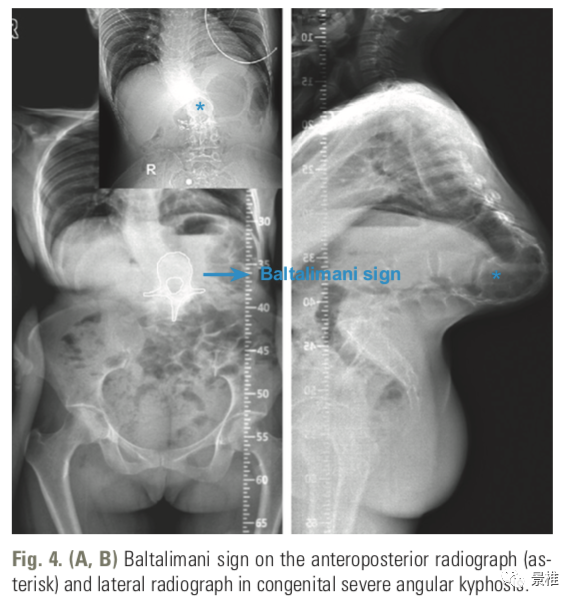 Baltalimani征阳性:脊柱严重角状后凸(SAK)的顶椎相邻椎体处于垂直翻转状态。在正位x线片上可以观察到椎体轮廓呈轴位观。