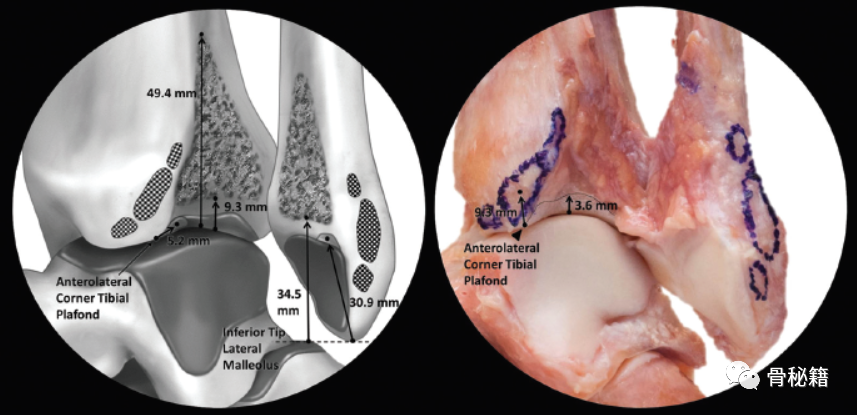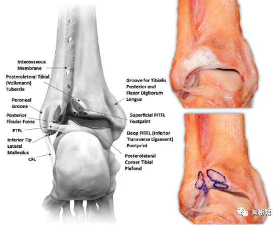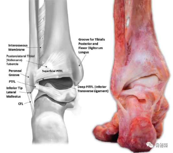 PITFL 也是梯形的,优越的纤维沿着胫骨后外侧结节的远侧边缘附着,然后融合到胫骨后皮质 。它几乎连续进入骨间膜,位于 PITFL 上方。PITFL 由浅层韧带和深层韧带(通常称为下横胫腓韧带)组成。浅层纤维位于距外踝下尖26.3mm处,韧带中心距胫骨后外侧8mm处,而深层纤维更密集并附着在腓骨和胫骨上的椭圆形止点。