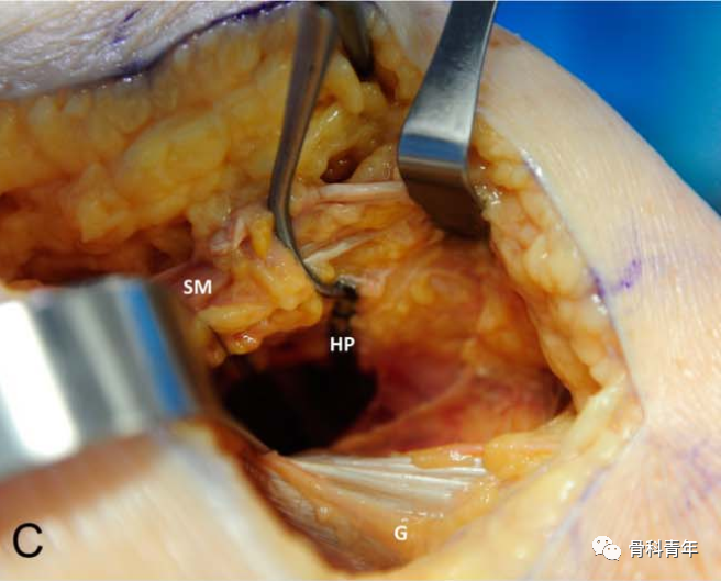 步骤3:常规后内侧切口,在膝关节屈曲20°下,显露腓肠肌内侧头并将其向后牵拉,沿着胫骨后柱骨面边缘松解软组织,预留钢板放置空间。在屈曲状态下可确保膝关节血管神经松弛,上述操作在血管神经束的前方进行。