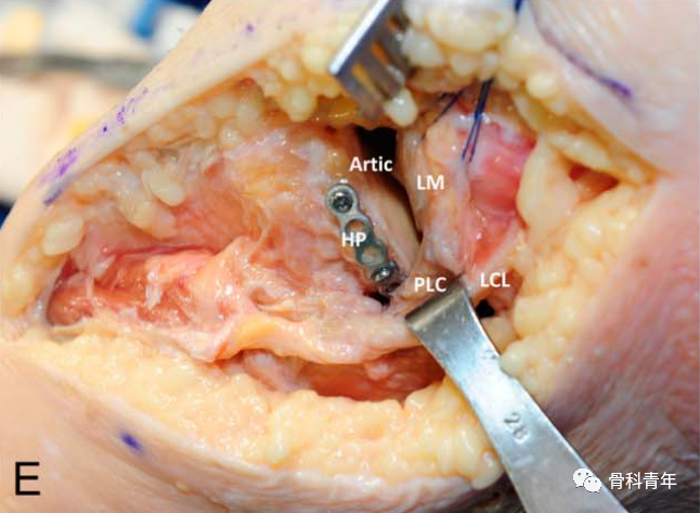 步骤1:患者仰卧位,标准前外侧切口,暴露髂胫束,并将其从Gerdy结节上剥离。切开膝关节外侧关节囊,暴露半月板及外侧副韧带,将半月板缝线固定,掀开半月板即可直视下观察外侧平台骨折及复位情况。松解外侧副韧带与胫骨近端之间的间隙,为防止钢板提供空间。
