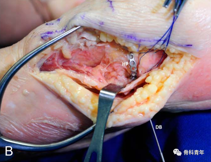 在复位满意后,将环形钢板塑形,通过平台后方建立的软组织隧道,穿出至外侧,并在外侧采用2枚2.7mm螺钉临时固定。