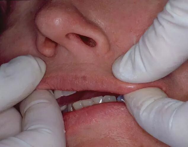 ※在患者唇上涂抹润滑剂,或者要求患者润湿嘴唇。因为软衬不会粘附在湿的区域。
