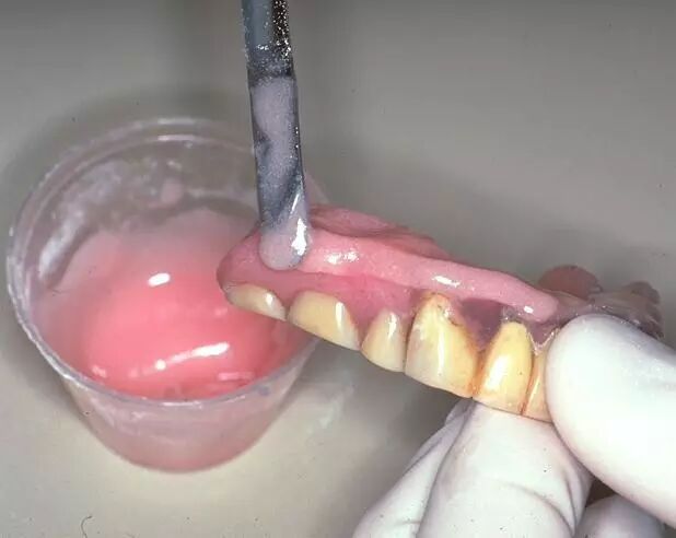 ※立即将混合物涂上完全干燥的义齿基托表面。