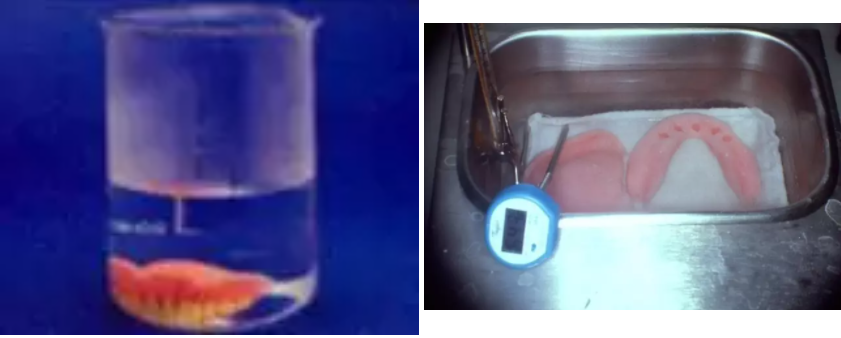※将义齿需要换衬的一面朝上,置入装满有蒸汽的热水中(50℃到74℃)固化10 分钟。如果有压力锅,可将义齿置入压力锅中,在热水中(20psi/1.4bar)固化15 分钟。
