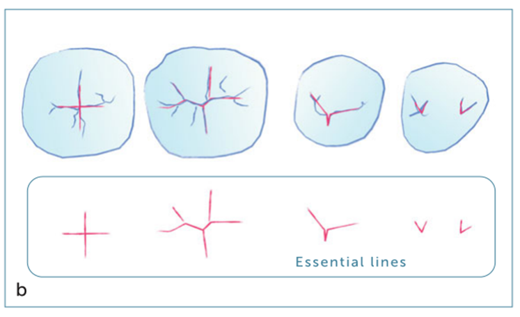 图6. 显示后牙咬合基本线图。(a)上颌后牙的基本线。(b)下颌后牙的基本线。从左到右:分别为第二和第一磨牙,以及第二和第一前磨牙。