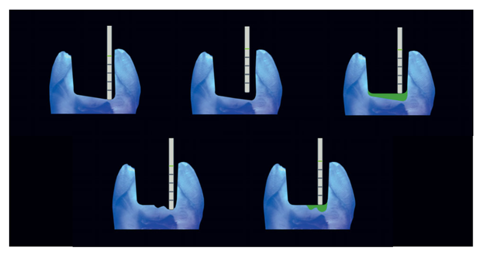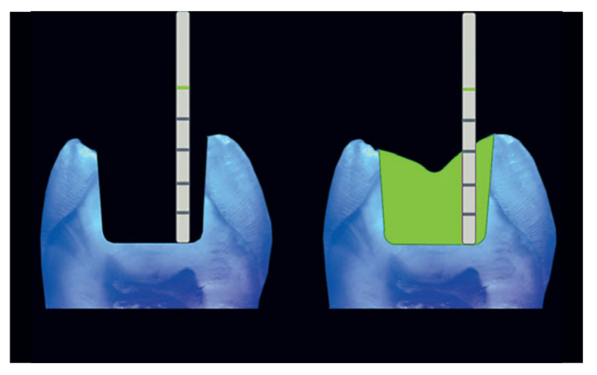 图3. 龋坏去除后,需要测量洞深并分析洞底。如果使用牙周探针测量的深度超过4 mm,建议用低粘度BFC薄层充填,这将使洞底规则获得标准洞型。