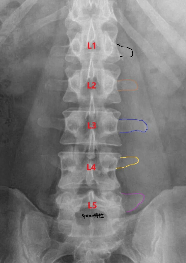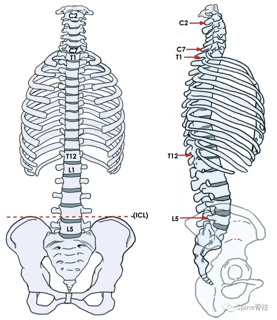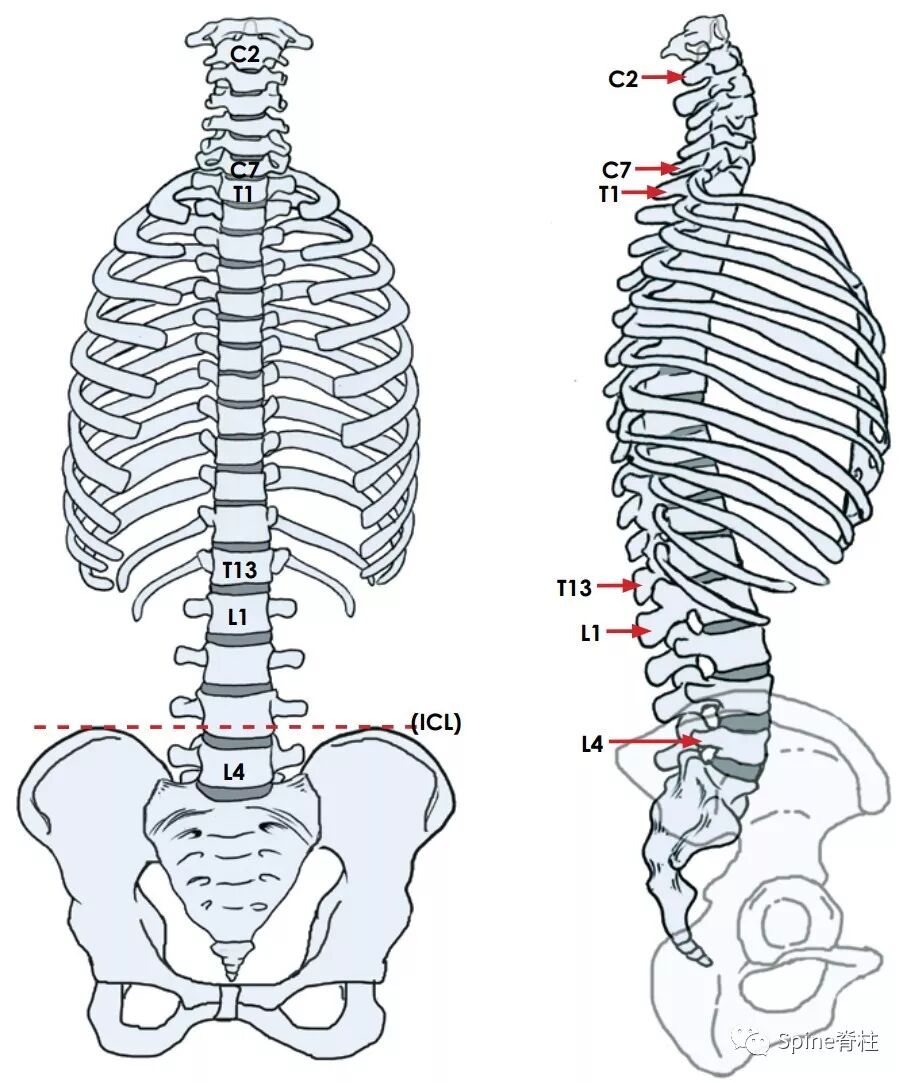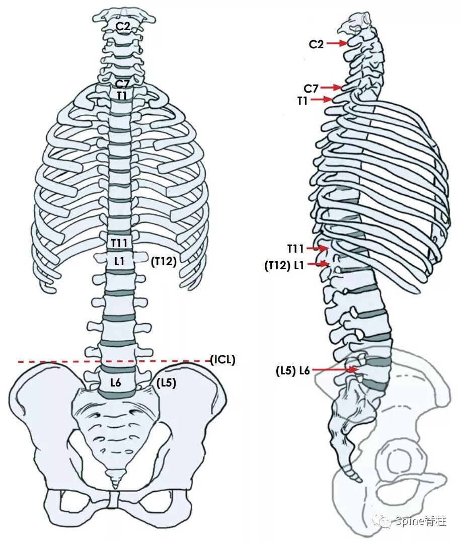 正常脊柱有12个胸椎,5个腰椎ICL:髂嵴连线