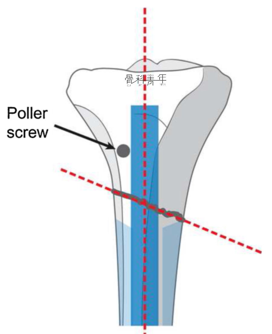 胫骨近端骨折,同理将Poller钉置于锐角处。