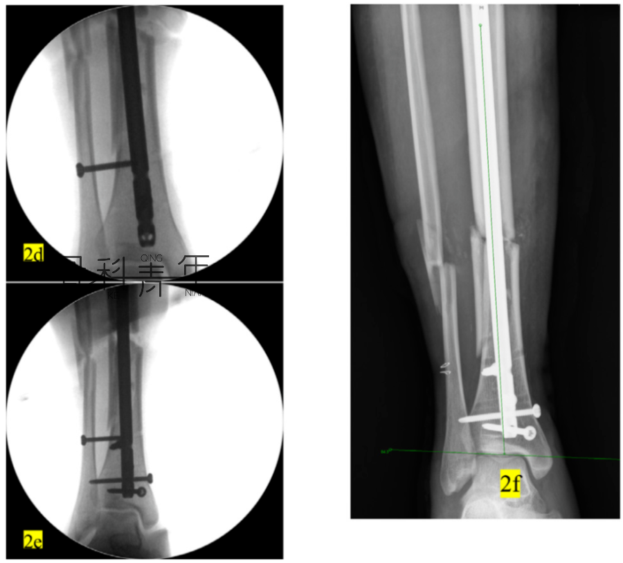 2a-2c:胫腓骨远端骨折,髓内钉固定,主钉插入及远端锁钉锁定后,可见骨折对线不良,存在移位。