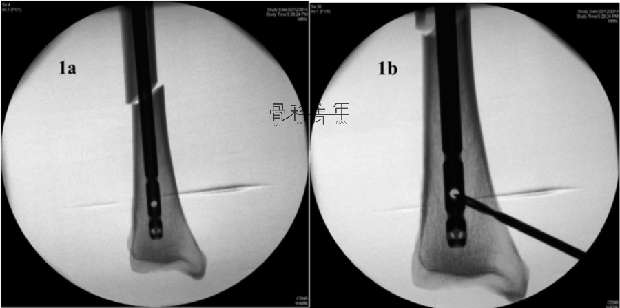 1a-1b:胫骨中段骨折采用髓内钉固定。可见置入主钉后骨折对线不良,存在侧方移位及成角畸形。