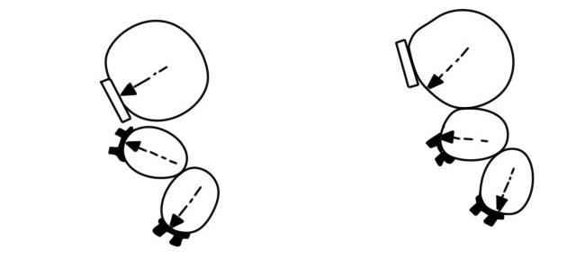 左图:托槽和颊侧管的位置正确;右图:托槽和颊侧管的位置不正确。假如像右图那样,绝对不可能将扭转的牙齿扭正。