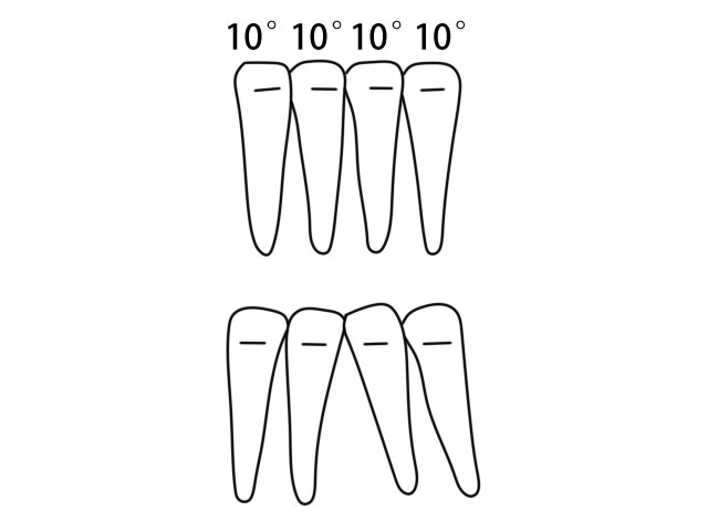 上下前牙的博尔顿(Bolton)氏宽度比率显示上颌切牙总宽度过大时,下颌切牙上托槽的倾斜度如图所示。这样,在矫治结束后,牙齿倾斜,能占居较多的间隙。